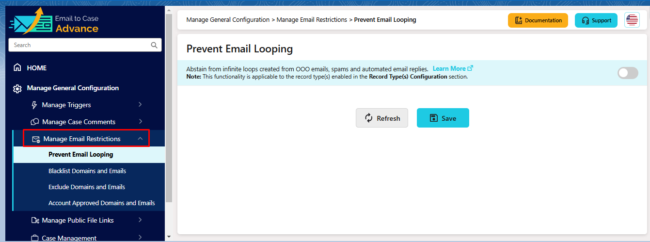 The Email Restrictions feature provides administrators with precise control over which domains and email addresses can participate in case communications. This functionality allows organizations to maintain security and communication standards while still enabling case creation from restricted sources. It's particularly useful for managing internal communications and controlling access to case teams while maintaining appropriate documentation. It has 4 settings: